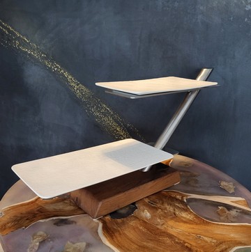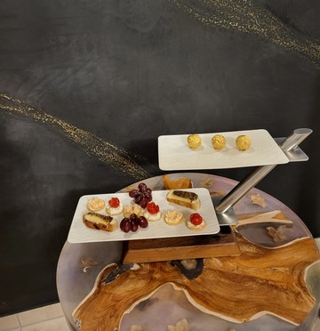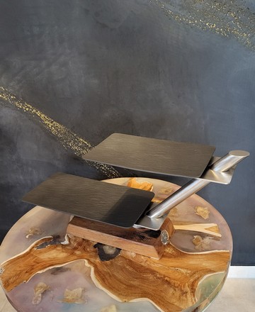Design-Etagere aus Holz & Edelstahl – handgefertigtes Statementstück. Diese außergewöhnliche Etagere verbindet modernes Design mit traditioneller Handwerkskunst. Klare Linien aus gebürstetem Edelstahl treffen auf einen massiven Holzsockel – ein spannender Kontrast, der jede Tafel aufwertet und sofort ins Auge fällt. Die schwebend wirkenden Ebenen bieten stilvollen Platz für Canapés, Pralinen, Käse, Antipasti oder feines Gebäck. Ob beim festlichen Empfang, im gehobenen Gastronomiebereich oder als exklusives Wohnaccessoire: Diese Etagere setzt Ihre Speisen gekonnt in Szene. Porzellanteller in schwarz oder weiß erhältlich. ✨ Besonderheiten auf einen Blick: - Handgefertigt mit Liebe zum Detail - Edle Kombination aus Massivholz, Porzellan und Edelstahl - Modernes, zeitloses Design - Stabiler Stand und hochwertige Verarbeitung - Ideal für Feiern, Events, Gastronomie oder besondere Anlässe - Diese Etagere ist mehr als ein Servierstück – sie ist ein Designobjekt, das Genuss und Ästhetik vereint. Für Menschen, die Wert auf Qualität, Individualität und Stil legen.